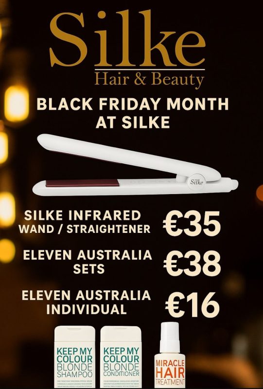 Black Friday offer until the end of November in salon only All Elevens retail products- €16 usually €23 Silke Infrared Curler- €35 usually €99! Silke Infrared Straightener- €35 usually €80 Elevens gift sets – €38 usually €45